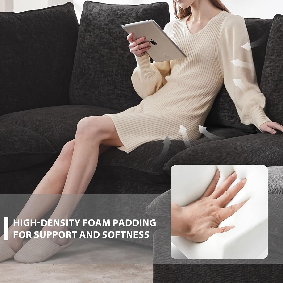 Upholstered in soft, cozy chenille fabric, the sofa delivers a plush feel while maintaining a sophisticated contemporary look. The U-shaped design provides plenty of room for everyone, making it the ideal centerpiece for living rooms, offices, lounges, or open-concept spaces.