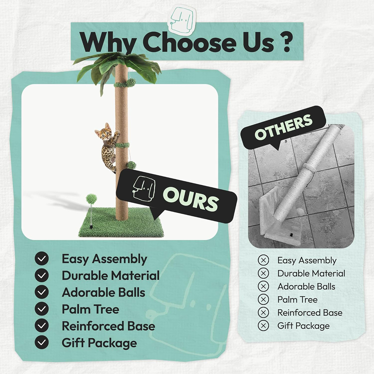 For added entertainment, the scratching post includes hanging play balls that keep kittens and active cats engaged for hours. The reinforced stable base ensures the post stays sturdy during energetic scratching and jumping, making it a reliable choice for everyday use.