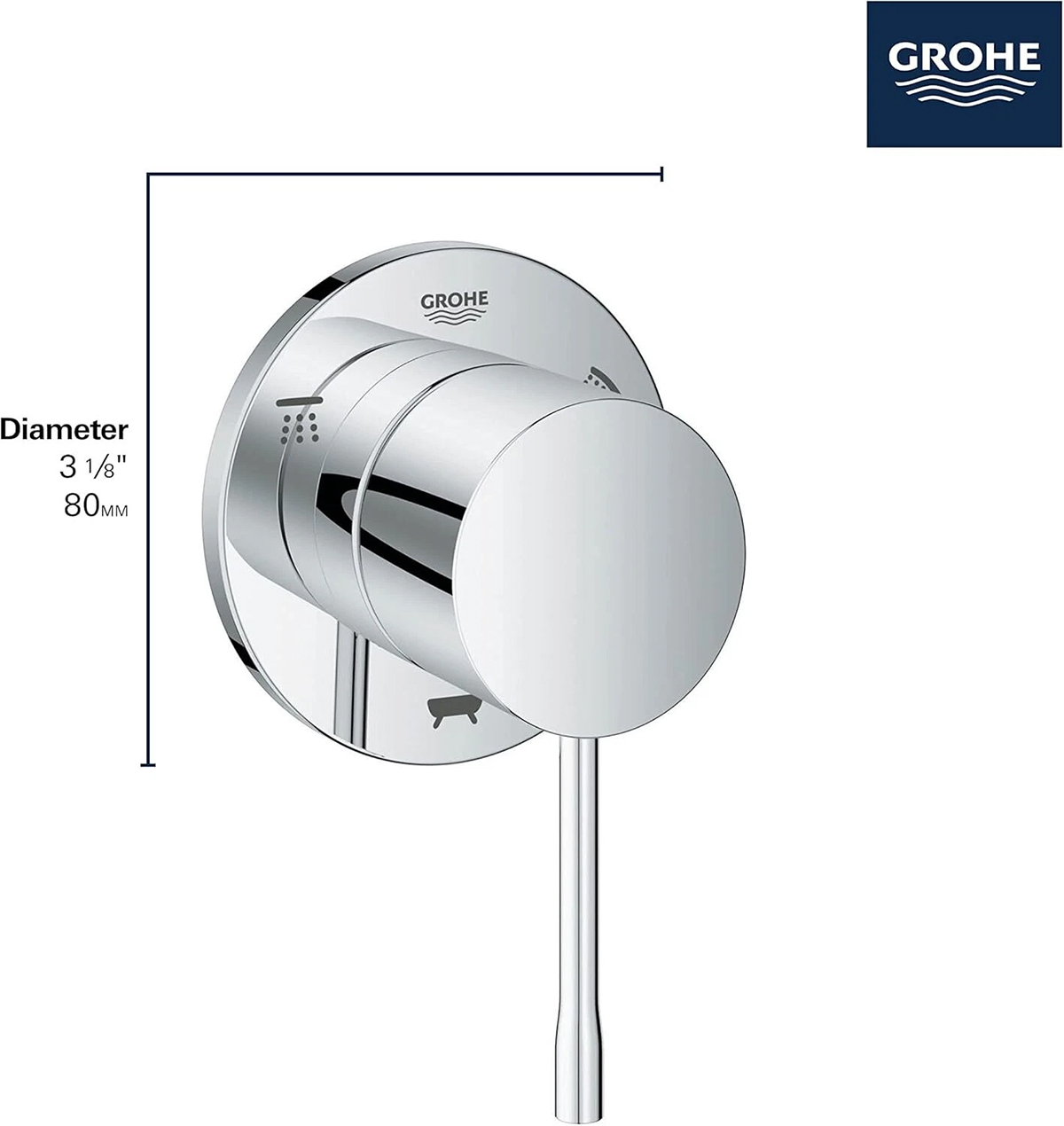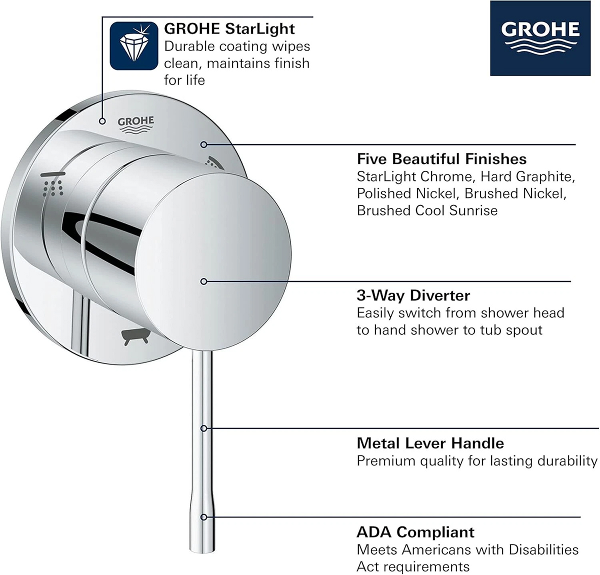 Sleek, sophisticated and available in an array of exquisite finishes, the Grohe Essence three-way diverter trim features the durable, Grohe StarLight finish for lasting beauty and a lever handle for smooth, precise operation. Designed to complement the entire Essence bath faucet collection and add a distinctive touch to your bathroom.