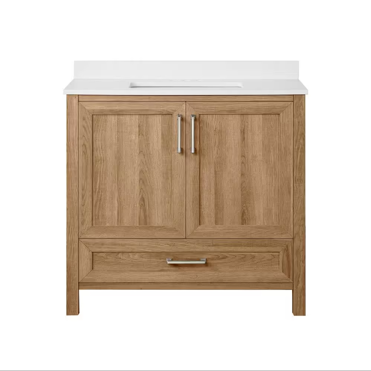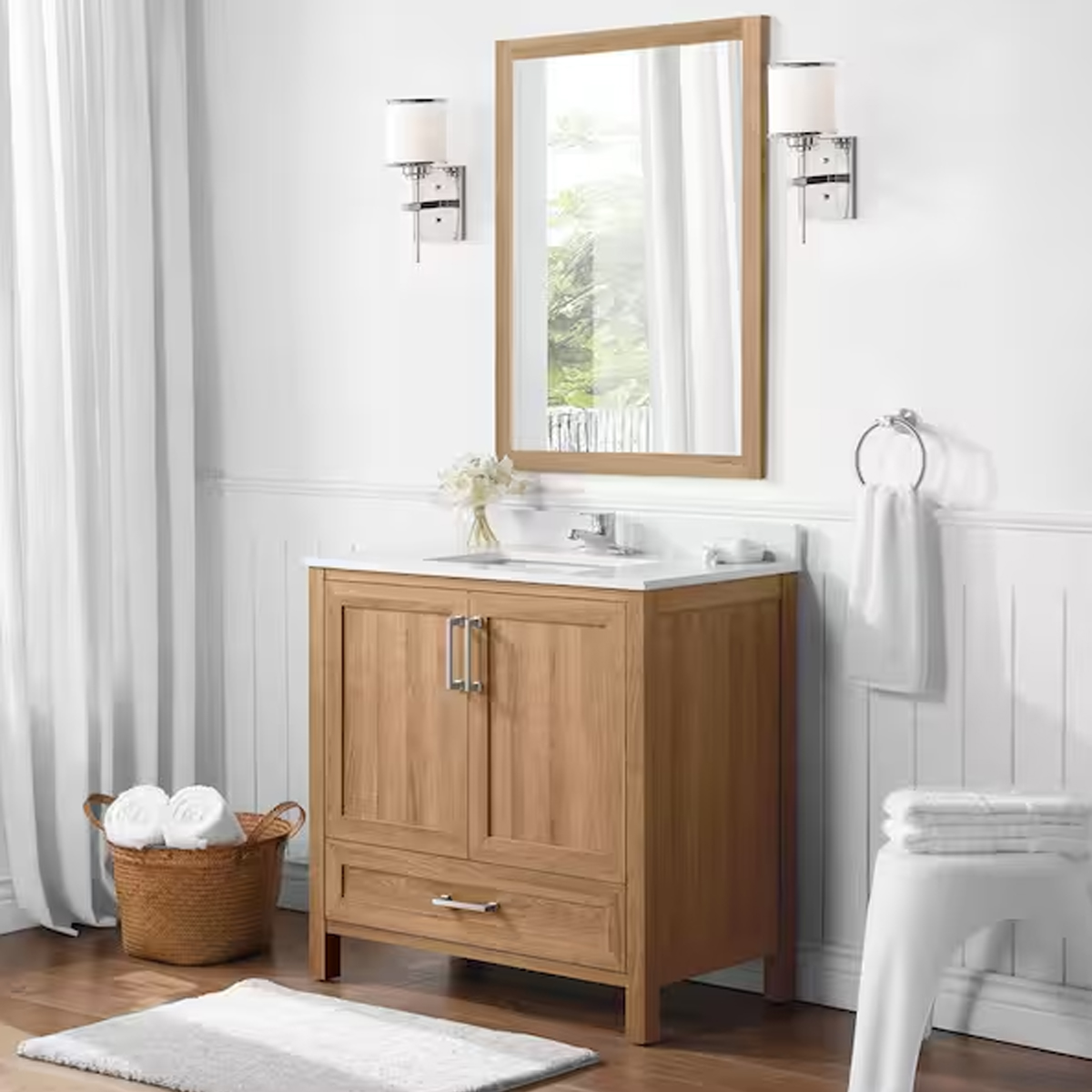 Storage is made simple with a spacious cabinet featuring an adjustable interior shelf and a smooth-gliding bottom drawer, ideal for towels, toiletries, and bathroom essentials. Finished with stylish brushed nickel hardware, the Moorside vanity delivers both beauty and practicality in one complete package.
